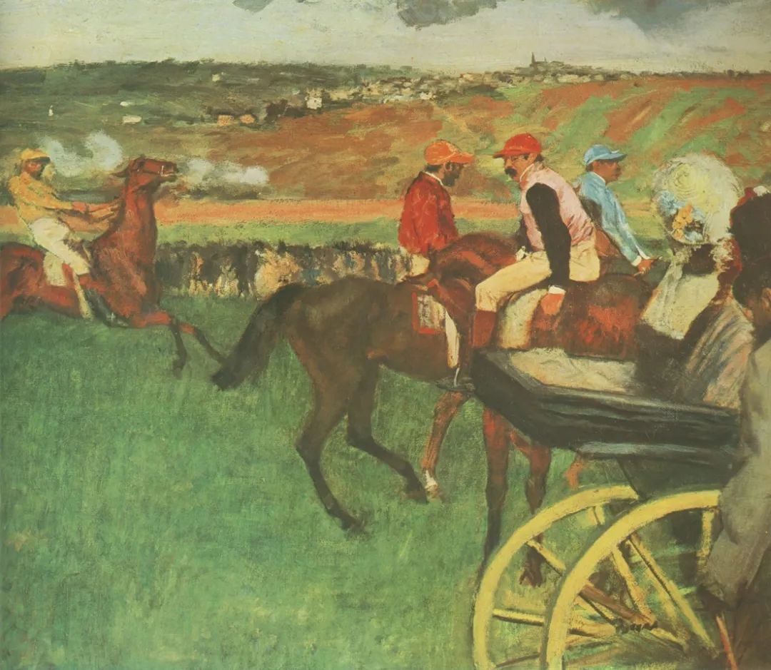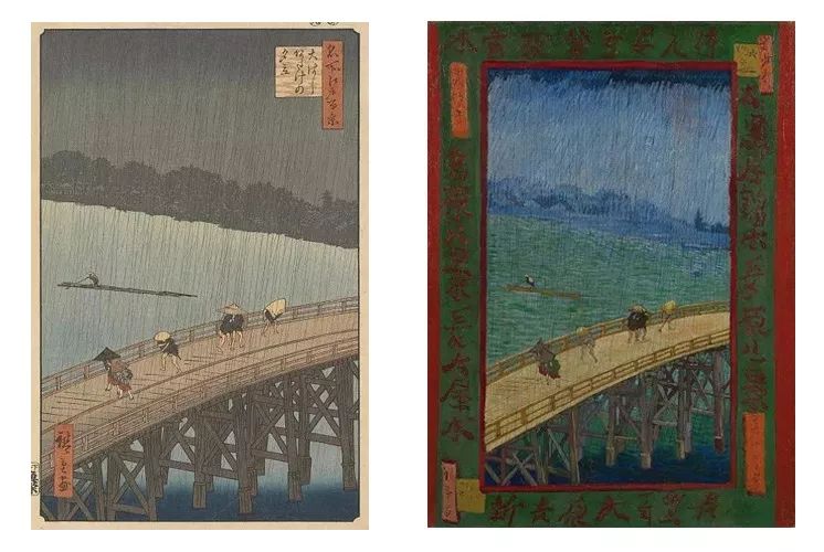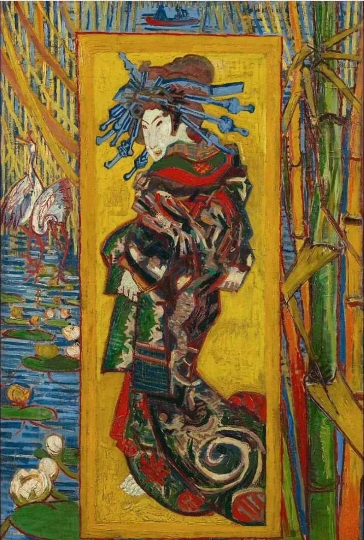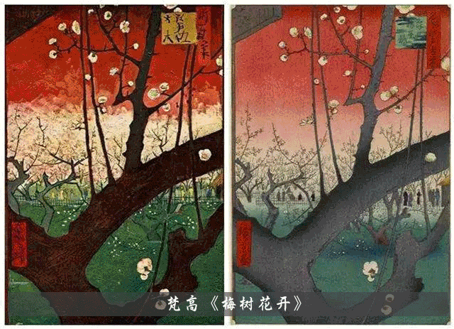 莫奈以妻子為模特的作品當然,歐洲人是單純被畫面吸引,因此誕生出不少東西合璧的作品。浮世繪因為受限于機器和材料,超大幅版畫需要拼接完成。這樣歐洲人就看到不少不完整的畫面,殘缺的構圖反而被一些印象派、后印象派畫家當做你沒見過的“全新構圖方式”進行創作。德加《賽馬會上》 1877—1880年 奧賽博物館藏再比如狂熱的浮世繪愛好者梵高,拿油畫顏料臨摹了歌川廣重的《龜戶梅屋》,然后他恭恭敬敬地把邊上的日文也寫上了,估計他完全沒意識到這其實是一張廣告,左右的日文是名字和地址——臨摹了一張煙花柳巷的傳單。梵高《開花的梅樹》(右)上日文為 龜戶梅屋,吉原區一家花花酒館的宣傳