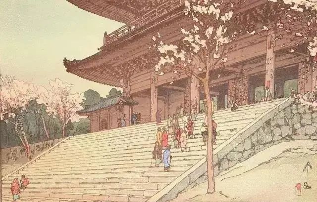 《佐佐寺的雪》—川瀬巴水明治維新后,大量西洋畫涌入日本,在全盤歐化的風氣下,日本畫家開始學習西方繪畫,屬于江戶時代的浮世繪就此沒落。但它的奇妙旅程還在繼續,20世紀初,不少畫家以浮世繪的材料與技法,創造出融合西方風格的新浮世繪,這些作品被稱為“新版畫運動”,是帶著印象派光影和透視的浮世繪,代表人物有川瀬巴水和吉田博。 新版畫作品《梅門》
