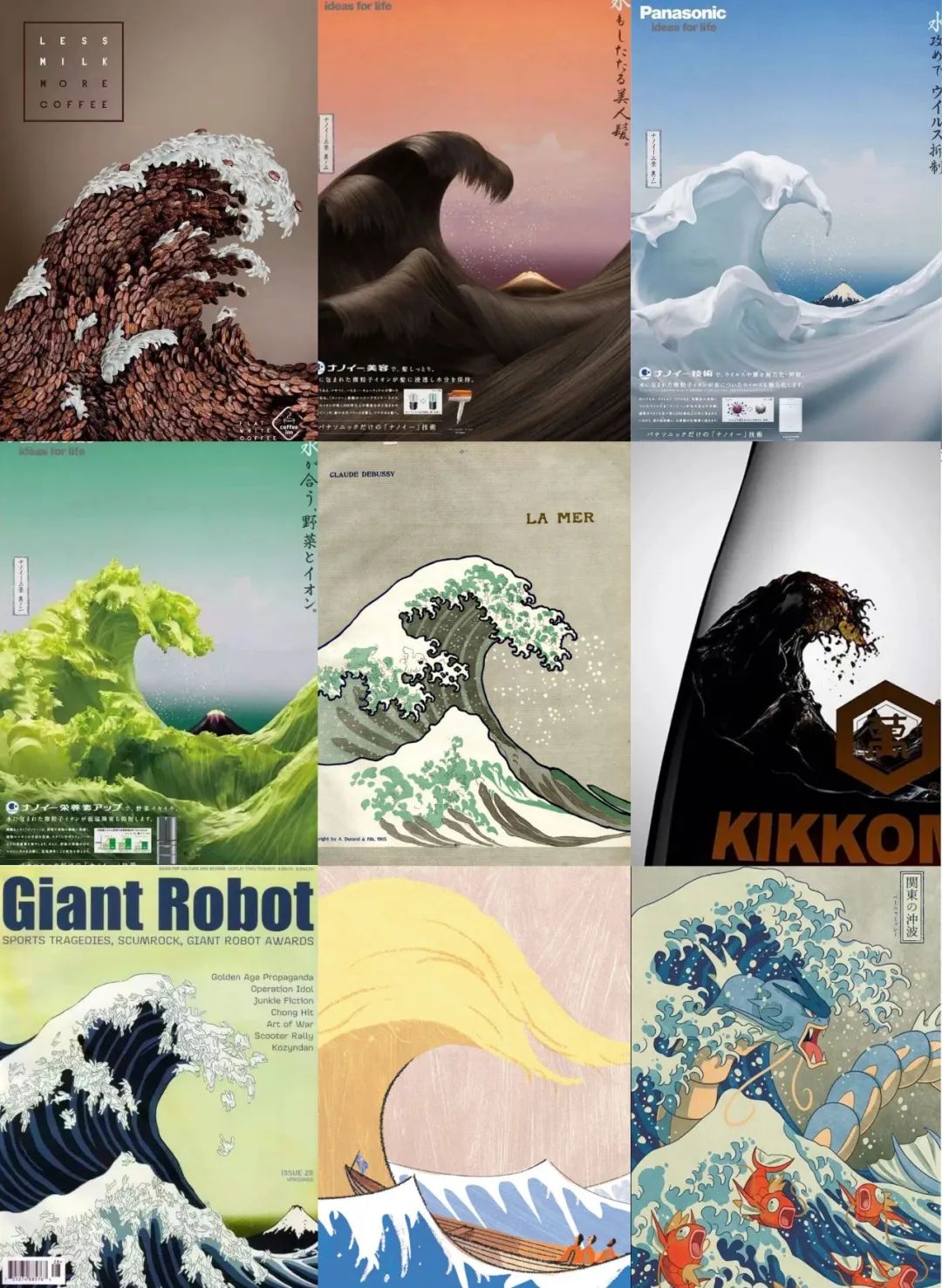 再放眼世界范圍,對這張畫的魔改可以用“無數”來形容。從咖啡豆到牛奶、生菜,甚至是神奇寶貝和川普的頭發都能化身《神奈川沖浪里》。
